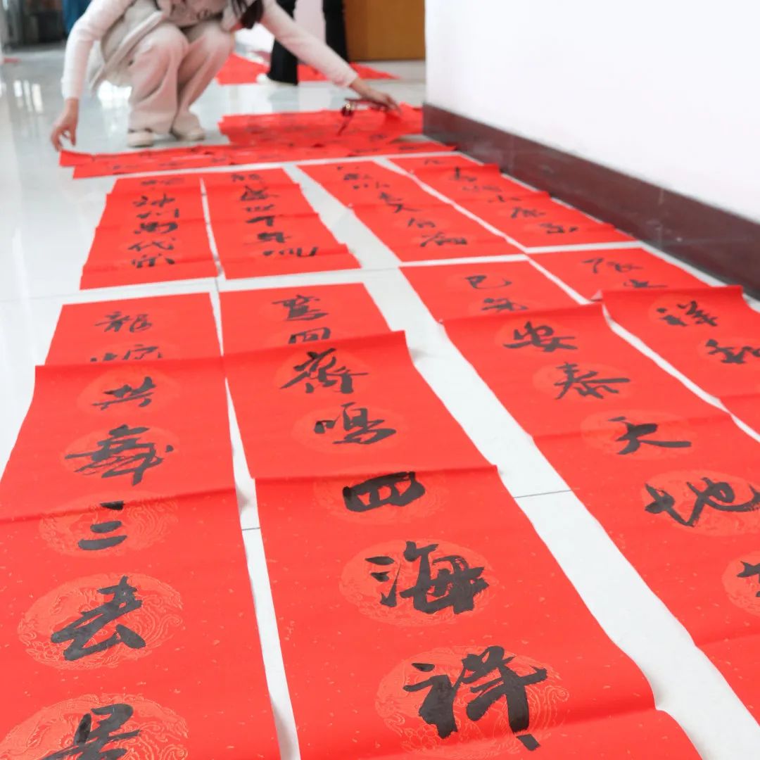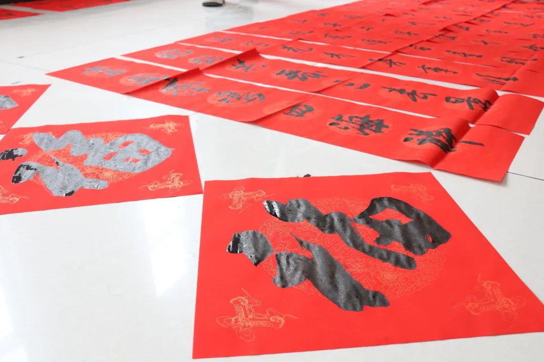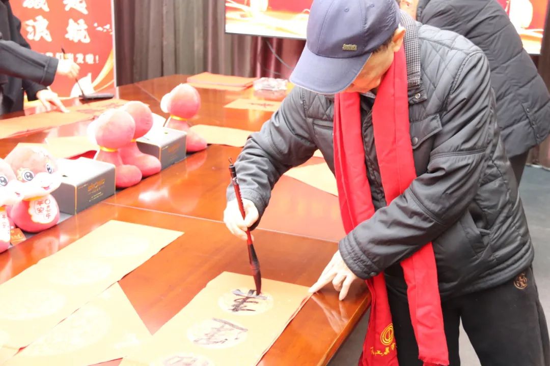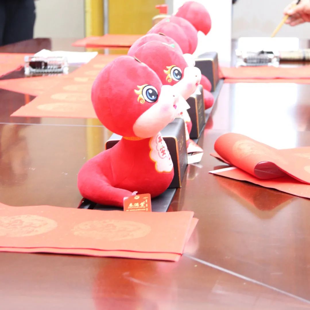 活動現(xiàn)場,書法老師們展紙執(zhí)筆,通過即興創(chuàng)作和現(xiàn)場演繹,為企業(yè)員工書寫、贈送春聯(lián)和“?!弊?。一張張充滿新年氣息的紅紙鋪滿桌面,書法老師們挽袖執(zhí)筆、點(diǎn)染丹青,筆墨方寸間,一個個不同字體的“?!弊?,一句句墨香四溢的祝福語句躍然紙上,揮毫潑墨間,將濃濃的新春祝福凝聚在筆尖,化作蛇年新桃。